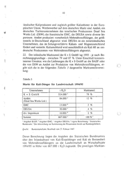 ländischer Kalproduzent und zugleich größter Kalianbieter in der Euro- päischen Union. Wettbewerber auf dem deutschen Markt sind Amfert, ein deutsches Tochterunternehmen des israelischen Produzenten Dead Sea Works Ltd. (DSW), die französische EMC, die DEUSA sowie diverse Im- porteure. Amfert produziert vornehmlich Mehrnährstoffdünger, der größ- tenteils in Deutschland abgesetzt wird. DEUSA ist ein mittelständisches Unternehmen, das im Solungsverfahren Kalium- und Magnesiumchlorid fördert und vertreibt. Kaliumchlorid wird ausschließlich als Kali 60 an ost- deutsche Produzenten von Mehrnährstoffdüngern abgesetzt. 22. Der inländische Marktanteil der K+S GmbHlag 1995 - je nach Be- rechnungsgrundlage - zwischen 79 und 87 %. Unter Einschluß konzern- interner Umsätze, wie die Lieferungen der K+S GmbH an die BASF oder die von DSW an Amfert zur Produktion von Mehrnährstoffdüngern, er- gibt sich die in der folgenden Tabelle 3 dargestellte Marktanteilsvertei- “lung: f Tabelle 3: Markt für Kali-Dünger für Landwirtschaft 1994/95 Unternehmen tK,O K+SGmbH 524.000 ° Amfert Marktanteil | 79% 84.000° 12 % (Dead Sea Works Ltd.) EMC 13.000 ® DEUSA 30.000 ‘ div. Importeure 16.000 2% 667.000 ° 100 % | Summe | 2% 9 4% " Angaben BASF. " Angaben EMC, ° Angaben DEUSA, "eigene Berechnung, ° Statistisches Bundesamt, Die Abweichung zur Summierung der Prozentsätze beruht auf Rundungsfehlern. Ouelle: Bundeskartellamt. Beschluß vom 27. Februar 1997 Dieser Berechnung liegen die Angaben des Statistischen Bundesamtes über den Inlandsabsatz von Kali-Einzeldünger und Kali als Bestandteil von Mehrnährstoffdüngern an die Landwirtschaft im Wirtschaftsjahr 1994/95 in Höhe von 667.000 t K,O zugrunde. Die jeweiligen Marktan-