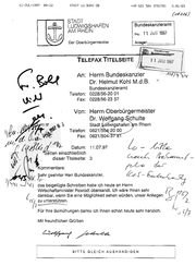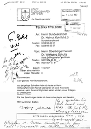 11-JUL-1997 89:22 +49 621 504 3781781 STADT LU BÜRO OB 5.01.03 (78206) | STADT Bundeskanzleramt LUDWIGSHAFEN AM RHEIN Eing.: 11, Juli 1997 Der Oberbürgermeister gar“ Telefon: Fax: Herrn Bundeskanzler Dr. Helmut Kohl M.d.B. Bundeskanzleramt 0228/56-20 01 0228/56-23 57 Von: SennOberbürgermeister Telefon: Fax E gi'L Datum: Ag N. l iR A Seiteneinschließlich dieser Titelseite: \ N Kornmentare: ® } yehr geehrter Herr Bundeskanzler, u 9 das beigefügte Schreiben habeich heute an Herrn Wirtschaftsminister Rexrodt übersandt, Ich wäre Ihnen sehr [ dankbar, wenn Sie eine Möglichkeit sehen würden, unser Anliegen “(57 zu unterstützen. — u ] —Z—Z—ZZTTTTTTT Für Ihre Bemühungen danke ich Ihnen schon heute sehr herzlich. Mit freund!ichen Grüßen BITTE GLEICH AUSHÄNDIGEN