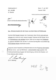 Referatsleiter 441 Bonn, 17. Juli 1997 441 - Ka 66 Hausruf: 2406 « [I\BKKZL\AL\ABTA\RL441\BRANDIS\KUNDS3.DOC Über Herrn Gruppenleiter 44 /- L 74H 77 Herrn Abteilungsleiter 4 a Herrn Chef des Bundeskanzleramtes Betr.: Stellungnahme in Sachen Kali & Salz/PCS(Kanada) als „non paper“ Beigefügt erhalten Sie eine als „non paper“ gestaltete Stellungnahme zur Kali & Salz/PCS-Fusion. Sie beruht auf der entsprechenden BK-Vorlage vom 4. Juli. X 07 (Dr.Brandis) YaZN r EA