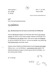 (-18570) Referatsleiter 441 Bonn, 17. Juli 1997 441 -Ka66 Hausruf: 2406 TABKKZL\AL\ABT4\RL441\BRANDIS\KUNDS3.DOC Über 7 Herrn Gruppenleiter44 /- CL 7 Ze Herrn Abteilungsleiter 4 % a K li Pu . 18 s te m ra le nz ka es nd Bu s e f d HerrnChe Betr.: Stellungnahme in Sachen Kali & Salz/PCS(Kanada) als „non paper“ Beigefügt erhalten Sie eine als ‚non paper“ gestaltete Stellungnahme zur Kali & Salz/PCS-Fusion. Sie beruht auf der entsprechenden BK-Vorlage vom 4. Juli. Ko (Dr. Brandis) 7 Rn, Y,