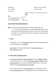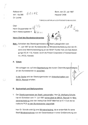-2. 15 bis 20 Mio. DM befürchtet, und bittet den Bundeskanzler um Unterstützung seines Anliegens. 2. BM Dr. Rexrodt hat heute bekanntgegeben, daß er die beantragte Minister- erlaubnis nicht erteilen wird (Presseerklärung in der Anlage). 3. Ob es nunmehr zu den vom Ludwigshafener Oberbürgermeister befürchteten Steuermindereinnahmen kommen wird, kann von hier nicht beurteilt werden, da dies von der weiteren Unternehmensopolitik der BASF abhängt. Die Referate 423 und 432 haben mitgezeichnet. Nacd: —_—. Dr. Brandis