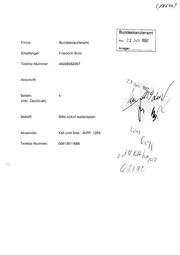 (Pe 16) Bundeskanzleramt Firma: Bundeskanzleramt Eing: 22, Juli 1997 Anlagen Empfänger: Friedrich Bohl Telefax-Nummer: 49228562357 Abschrift: Seiten: (inkl. Deckblatt) Betreff: Bitte sofort weiterleiten Absender: Kali und Salz - A\PP- 1253 Telefax-Nummer: 05613011666 us, Ir VIL R 2 ho...