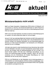 2er, I. 19977713:33° KALT UND SALZ ABT. AP NR. 284 S.1 Datum/Date ! 22.07.97 Seiter/Pages Telefax / Telecopy AnfTe 1+2 Von/From Kali und Salz Beteiligungs AG AbtDept, Abt/Dept " Presse- und Öffentlichkeitsarbeit Name Telefax-Nr. Name Telsfar/Phone KR Henf 0361/301-1322 Telsfax-Nr. 035621/301-1656 Sollte nicht alles lesbar sein, bitten wir um Rückruf. Please, call us, If llegibis. Zussmmenschluß PCS/Kali und Sak Sehr geehrte Damen und Herren, im Rahmen einer heutigen Pressekouferenz hat der Bundeswirtschaftsminister seine Ent- scheidung über den Antrag auf Ministererlaubnis im Zusammenschlußverfahren PCS und Kal und Salz bekanntgegeben. Die BASF Aktiengssellschaft hat zu der Entscheidung des Bundeswirtschaftsministers in ei- ner Presse-Information Stellung genommen, die in der als Anlage beigefügten Schnellinfor- mation für die Mitarbeiter der Kal und Salz-Gruppe "K+S aktuell" wiedergegeben ist. Wir übersenden Ihnen diese zu Ihrer Information Mit freundlichen Glückauf KALI UND SALZ BETEILIGUNGS AKTIENGESELLSCHAFT Anlage