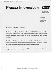 22-JUL-1988 11:09 BUS’/R +49 38 24511573 5.089 _ > A I Bundesanstaitfür Kali und Salz vereinigungsbedingte Sonderaufgaben Beteiligungs AG in Gemeinsame Presse-Information del Einigung über den Erwerb des BvS-Antells an Kali und Salz GmbH durch Kali und Salz Beteiligungs AG Nach langen und intensiven Verhandlungen hat die Kali und Salz Beteiligungs AG von der Bundesanstalt für vereinigungsbedingte Sonderaufgaben deren Anteil von 49 % an der Kali und Salz GmbH mit Wirkung vom 01.01.1998 erworben, nach- dem die Zustimmung der Gremien vorliegt. Die entsprechende Milteilung über die erzielte Einigung liegt der Kommission der Europäischen Gemeinschaft vor. Für den Erwerb leistet die Kali und Salz Beteiligungs AG an die BvS eine Barzahlung von 250 Mio, DM. Das bei der EU-Kommission anhängige Beihilfeverfahren wird beendet und der Verlustausgleich damit auf 150 Mio. DM begrenzt, im Rahmen dieses Betrages wird der von BvS an die Kali und Salz GmbH zu leistende, 1993 von der EU-Kommission bereits genehmigte Verlustausgleich um 65 Mio. DM auf 70 Mio. DM verringert. Mit dieser Vereinbarung wird die wichtige Privatisierung der ostdeutschen Kaliindustrie durch Treuhandanstalt und BvS erfolgreich abgeschlossen. Insgesamt konnten rd. 3000 Arbeitsplätze für Mitarbeiter aus den neuen Bundesländern bei der Kali und Salz GmbH erhalten werden, insbesondere auf, den Standorten Zielitz, Bernburg und Unterbreizbach sowie beim Verwahrbergbau n Merkers. Insgesamt beschäftigt die Kali und Salz-Gruppe 8400 Mitarbeiter, davon über 400 Auszubildende in überwiegend bergbaufremden Berufen. Nach dem 1993 vereinbarten Fusionskonzept Ist das Gemeinschaftsunternehmen von Kali und Salz Beteiligungs AG und BvS während der Sanierungsphase bis Bmdesanstalt für Kali und Salz Beteiligungs vereinigungsbedingte Sonderaufgaben Aktiengesellschaft Pressestelle Presse- und Öffentlichkeitsarbeit Telefon: (030) 295 11 040 Telefon: (0561) 301-1722 [2