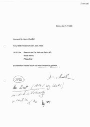 (32 462) 8 9 9 1 . 7 . 7 n e d Bonn, Vermerk für Herrn ChefBK Anruf MdB Heiderich betr. 28.8.1998: 16.00 Uhr Besuch der Fa. Kali und Salz- AG Werk Werra Pilippsthal Einzelheiten werden noch von MaB Heiderich geliefert. e a I ER | t a d . r U ( I v L r e i d hl ÖL — Be ur . . a , a B . la Tu h t c n b r Vo Be ,2z ar bh.