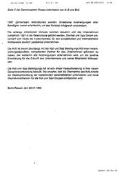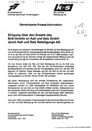 22-JUL_-1958 11:09 +43 38 24511573 BVUS/PFK 5,18 Seite 2 der Gemeinsamen Fresse-Informalion von K+S und BvS 1937 gemeinsam restrukturiert worden. Erhesbliche Anstrengungen aller Ssteillgten waren erforderlich, um das Konzept erfolgreich umzusetzen. Die anfangs erheblichen Verluste konnten reduzieri und das Unlernehmen schließlich 1997 in die Gewinnzons geführt werden. Die Kali und Salz GmbH prä- saniert sich heute als modernisienes, für den europäischen und inlernalisnalen Wettbewerb deutlich gestärktes Unternehmen. Die BvS ist davon überzeugt, mit der Kali und Salz Beteiligungs AG einen verant- wortungsbewußien, kompetenten Partner für das Unternehmen gefunden zu haben, der weilerhin alle Anstrengungen unternehmen wird, um die positive Entwicklung für die Zukunft des Unternehmens und seiner Mitarbeiter fortzuset- zen. Die Kal und Salz Beteiligungs AG ist sch dieser Herausforderung in Ihrer neuen Gesamtverantwortung bewußt. Sie erwartet, daß die Übernahme des BvS-Anteils die Welterentwicklung der bestehenden Geschäftsfelder unterstützen und neue Wachstumschancen für die Kali und Salz-Gruppe ermöglichen wird. Berlin/Kassel, den 22.07.1998 GESAMT SEITEN 18
