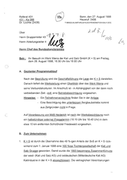 Referat 431 431 - Ka 066 Dr. Lochte (2428) Vfg. Bonn, den 25, August 1998 Hausruf: 2406 T:\BKKZLUALWBTA\RL431\LOCHTEISONSTICK-KALI.DOC | AL, Herrn GruppenleiterN UI f | Herrn Abteilungsleiter 4 Herrn Chef des Bundeskanzleramtes r 24: ler Kopie: Herrn Neumann Betr.: Ihr Besuch im Werk Werra der Kali und Salz GmbH am Freitag, dem 28. August 1998, 16.30 Uhr bis 18.00 Uhr 1. Die Kali und Salz GmbH (K + S) hat für Ihren Besuch im Werk Werra das in der Anlage beigefügte Programm vorgeschlagen. Hinweis: Der Betriebsrat wird auch vertreten sein. Sofern Sie mit diesem Programmvorschlag einverstanden sind, würden wir das Programm gegenüber K + S bestätigen. Hinweis: Aus dem Hause wird Sie Herr Kindler begleiten. 2. Van PA Aa h 4 MaB Heiderich wird an dem Besuch des Werkes teilnehmen. Er wird in Ab- stimmung mit K + S einen Photographen (Mitarbeiter seines Büros) mitbrin- gen. 3. Ein mit Ihrem Büro abgestimmter Pressetermin findet auf Veranlassung von MaB Heiderich im Anschluß an die Werksbesichtigung außerhalb im SchloßR- hotel Friedewald (etwa 10 km vom Werk entfernt) von 18.15 Uhr bis 18.45 Uhr statt. 27 Dr. Brandis