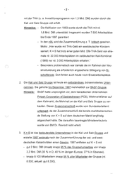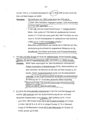 .2- mit der THA (u. a. Investitionsprogramm von 1,3 Mrd. DM) wurden durch die Kali und Salz Gruppe voll erfüllt. Hinweise: - Die Kalifusion von 1993 wurde durch die THA mit rd. 1,56 Mrd. DM unterstützt. Insgesamt wurden 7.500 Arbeitsplätze bis Ende 1997 garantiert. - Inden nBL wird die Zusammenführung z. T. kritisch gesehen. Motto: „Hier wurde mit THA-Geld ein westdeutscher Konzern saniert. K + S hat trotz einer guten Mrd. DM-THA-Geld von ehe- mals rd. 32.000 Arbeitsplätzen im ostdeutschen Kali-Kombinat (1989) nur rd. 3.000 Arbeitsplätze erhalten.“ - Besonders problematisch war damals die im Rahmen der Neu- strukturierung als erforderlich angesehene Stillegung von Bi- schofferode. Dort fehlen auch heute noch Ersatzarbeitsplätze. 2. Die Kali und Salz Gruppe ist heute ein selbständiges, börsennotiertes Unter- nehmen. Sie gehörte bis Dezember 1997 mehrheitlich zur BASF-Gruppe. Hinweis: BASF hatte ursprünglich vor, dem kanadischen Unternehmen Potash Corporation of Saskatchewan (PCS), Weltmarktführer auf dem Kalimarkt, die Mehrheit an der Kali und Salz Gruppe zu ver- kaufen. Dieser Zusammenschluß wurde vom Bundeskartellamt untersagt, da der Zusammenschluß die bereits marktbeherrschen- de Stellung von K + S auf dem deutschen Markt langfristig abgesichert hätte. Die daraufhin beantragte Ministererlaubnis wurde von BM Dr. Rexrodt nicht erteilt. 3. K+5 ist das bedeutendste Unternehmen in der Kali und Salz-Gruppe und erzielte 1997 erstmals nach der Zusammenführung der ost- und west- deutschen Kaliaktivitäten einen Gewinn. 1997 entfielen auf K+ S mit - gut2 Mrd. DM Umsatz knapp 95 % des Gruppenumsatzes von knapp 2,2 Mrd. DM (33 % in D; 40 % im übrigen Europa; 27 % in Übersee), - knapp 8.100 Mitarbeitern knapp 95 % aller Mitarbeiter der Gruppe (rd. 8.500; aktuell: gut 8.300),