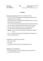 Referat 431 431 - Ka 066 Dr. Lochte (2428) Vfg. Bonn, den 27. August 1998 Hausruf: 2406 TA\BKKZLIALABTARL431\LOCHTE\SONSTICK-KALIT.DOC Teilnehmer Seitens des Unternehmens werden an dem Gespräch teilnehmen: Herr Gerd Grimmig, Vorstandsmitglied der Muttergesellschaft Kali und Salz Beteiligungs AG, Ressort Bergbau; ‚ Herr Peter Backhaus, Vorstandsmitglied der Muttergesellschaft Kali und Salz Beteiligungs AG, Ressort Personal; Herr Dr. Norbert Knöpfel, Werksleitung des Werkes Werra, Bereich Produktion; Herr Dieter Friedrich, Werksleitung des Werkes Werra, Bereich Bergbau; Herr Uwe Handke, Pressereferent der Kali und Salz Beteiligungs AG; Herr Roland Gimpel, stellvertretender Betriebsratsvorsitzender; Hinweis: Herr Gimpel war früher Mitarbeiter der ostdeutschen Kaligesell- schaft. Herr Dr. Arne Brockhoff, hauptamtlicher Geschäftsführer des Kalivereins e.V. (kleiner Arbeitgeberverband). In Begleitung von Chef BK werden teilnehmen: - Herr Heiderich, MqaB; - Herr Kindler; - Herr Möller, Büro MaB Heiderich, als Photograph beim Termin. Photographen im Eingangsbereich: - Herr Paris (gesprochen: Pariss), Hersfelder Zeitung, und voraussichtlich - Herr Sindel, Heimat-Nachrichten