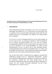 Seite 2 PCS ist heute der weltgrößte Kaliproduzent mit im wesentlichen kanadischen Kaligruben (Gesamtkapazität über 6 Mio to K,O, Produktion ca. 3,5 Mio to K,O p.a.) mit Hauptabsatzgebieten in Amerika und Fernost. In Deutschland ist PCS nicht vertreten, im übrigen Europa nur in sehr geringem Umfang. Die sehr wertstoffreichen kanadischen Lagerstätten - und die derzeitigen Wechselkurse - ermöglichen PCS einen erheblichen Vorsprung in den Produk- tionskosten gegenüber den westeuropäischen Produzenten, der im Wettbewerb auf den Überseemärkten entscheidend ist. Für Lieferungen nach Europa wird der Kostenvorsprung durch die für PCS entstehenden hohen Transportkosten deutlich verringert. Für Deutschland kommt hinzu, daß PCS nicht über die in Deutschland weit überwiegend nachgefragten (sulfat- bzw. magnesiumhaltigen) Spezialkalisorten verfügt. Zusammenschlußverfahren Das Zusammenschlußvorhaben fällt in die Zuständigkeit des Bundes- kartellamtes, Berlin. Es ist dort am 9. Oktober 1996 angemeldet worden. Das Amt hat mit Verfügung vom 28. Februar 1997 den Zusammenschluß untersagt. Die Entscheidung ist noch nicht rechtskräftig. Nach Auffassung des Amtes, das den Zusammenschluß dem Gesetz gemäß nur aufgrund der deutschen Verhältnisse zu beurteilen hatte, führt der Zusammen- schluß zur Verstärkung einer wegen einer des Erhöhung marktbeherrschenden Abwehrpotentials der Stellung Kali und insbesondere Salz GmbH gegenüber dem Wettbewerb und dem Fortfall des "potentiellen Wettbewerbers" PCS. Die Anmelder halten die Auffassung des Amtes für widersprüchlich und unzu- treffend. Sie beabsichtigen jedoch nicht, hiergegen Beschwerde einzulegen, da ein damit verbundener längerfristiger Schwebezustand die Führung der laufenden Geschäfte unvertretbar belastet und auch Belegschaft und Aktionären nicht zugemutet werden kann. Die abgeschlossenen Verträge sehen deshalb ihre automatische Beendigung vor, wenn nicht der Zusammenschluß bis 31. Juli 1997 kartellrechtlich genehmigt ist oder die Parteien eine Fristverlängerung vereinbaren.