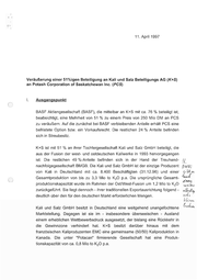 11. April 1997 Veräußerung einer 51%igen Beteiligung an Kali und Salz Beteiligungs AG (K+S) an Potash Corporation of Saskatchewan Inc. (PCS) Ausgangspunkt BASF Aktiengesellschaft (BASF), die mittelbar an K+S mit ca. 76 % beteiligt ist, beabsichtigt, eine Mehrheit von 51 % zu einem Preis von 250 Mio DM an PCS zu veräußern. Auf die zunächst bei BASF verbleibenden Anteile erhält PCS eine befristete Option bzw. ein Vorkaufsrecht. Die restlichen 24 % Anteile befinden sich in Streubesitz. K+S ist mit 51 % an ihrer Tochtergesellschaft Kali und Salz GmbH beteiligt, die aus der Fusion der west- und ostdeutschen Kaliwerke in 1993 hervorgegangen ist. Die restlichen 49 %-Anteile befinden sich in der Hand der Treuhand- d. nachfolgegesellschaft BMGB. Die Kali und Salz GmbH ist der einzige Produzent Basta, von Pig Kali in Deutschland mit ca. 8.400 Beschäftigten (31.12.96) und einer Gesamtproduktion von bis zu 3,3 Mio to K,O p.a. Die ursprüngliche Gesamt- produktionskapazität wurde im Rahmen der Ost/West-Fusion um 1,2 Mio to K,O zurückgeführt. Sie liegt dennoch - ihrer traditionellen Exportausrichtung folgend - Kawch weile aller. el, 2 deutlich über den für den deutschen Markt erforderlichen Mengen. kleinem Kali und Salz GmbH besitzt in Deutschland eine weitgehend unangefochtene Marktstellung. Dagegen ist sie im - insbesondere überseeischen - Ausland einem erheblichen Wettbewerbsdruck ausgesetzt, der bislang eine Rückkehr in die Gewinnzone verhindert hat. K+S besitzt darüber hinaus mit dem französischen Kaliproduzenten EMC eine gemeinsame (50/50) Kaliproduktion in Kanada. Die unter "Potacan" firmierende tionskapazität von ca. 0,8 Mio to K,O p.a. Gesellschaft hat eine Produk- hhoduae