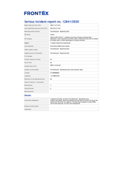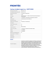 Serious incident report no. 12877/2020 Report date and time (UTC) 2020-12-02 11:49 Last modification date and time (UTC) 2021-07-27 14:24 Reporting entity/function Text Removed – Reporting Tools SIR Status Closed Valid to 2021-04-30: 3 - Incidents involving Frontex staff and participants in SIR Category Frontex activities Subject 2 Text Removed - Human Resources tested positive for COVID 19 Joint operation Flexible Operational Activities 2020 Land JORA incident number 0 Original source of information Text Removed - Human Resources FX SI Handler Frontex resources involved No Use of force No 2020-12-02 09:00 Incident dates (UTC) Location of the incident Text Removed – Operational Area Csongrád, Hungary Latitude 46.4250000000 Longitude 20.2372222222 Reference to the operational area No Type of resources / involvement Dead persons Injured persons Missing persons Details Text Removed - Human Resources deployed to Text Removed – Operational Area reported to Text Removed – Human Resources on 30.11.2020 he does not feel well enough to carry out his night shift with some coughing symptoms. With the exception of coughing the Text Removed - Human Resources didn’t show more negative symptoms of Covid-19 infection. For prevention measures his night shift Information/allegations on 30.11.2020 Text Removed – Reporting Tools was cancelled and he was recommended to undergo Covid-19 test on 01.12.2020 in the morning hours. Until getting result of the test he was going to be isolated at his accommodation Text Removed – Operational Area together with his colleague. • On 01.12.2020 in the morning hours Text Removed – Human Resources informed Text Removed – Human Resources about positive results of Covid-19