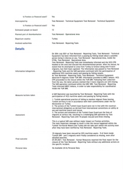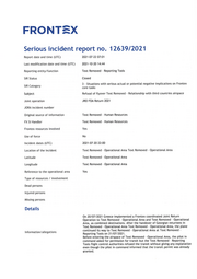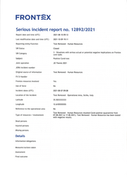 FRONT=X Serious incident report no. 12892/2021 Report date and time (UTC) Last modification date and time (UTC) Reporting entity/function SIR Status SIR Category Subject Joint operation JORA incident number Original source of information FX SI Handler Frontex resources involved Use of force Incident dates (UTC) Location of the incident Latitude Longitude Reference to the operational area Type of resources / involvement Dead persons Injured persons Missing persons Details Information/allegations Measures/actions taken Assessment Final outcome 2021-08-10 09:12 2021-10-09 19:11 Text Removed - Human Resources Closed 3 - Situations with serious actual or potential negative implications on Frontex core tasks Positive Covid test JO Themis 2021 Text Removed - Human Resources Yes No 2021-08-07 09:08 Text Removed - Operational Area, Sicilia, Italy 35.5033333333 12.6105555555 No Text Removed - Human Resources resulted Covid positive (quarantine from 07.08.2021 to 17.08.2021). Text Removed - Human Resources has been tested with negative results.