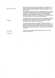 Measures/actions taken Assessment Final outcome Personal data Upon request for clarification from the Text Removed - Human Resources, Text Removed - Reporting Tools reported that the incident was categorized as prevention from illegal border crossing from Belarus (Text Removed - Reporting Tools attached). The coordinates provided by Text Removed - Reporting Tools and Text Removed - Reporting Tools, even if different, show that the migrants were intercepted in the territory of Lithuania. However, the incident has been categorized as “Prevention of Illegal Border Crossing from Belarus”. This event could be qualified as a potential violation of EU or international law, in particular related to Fundamental Rights and international protection obligations. Following the launch of the rapid border intervention, the Republic of Lithuania has per protocol of the Government’s session of 2 August 2021 and decision of the Minister of Interior, introduced a new border management procedure. The paragraph 3 of the said decision reads as follows: “3, Persons who have crossed the State border in places other than those referred to in point 1 and who are in the border area and who seek asylum in the Republic of Lithuania shall not be admitted to the territory of the country and shall be directed (required to proceed) from the territory of the country to the nearest international border crossing point or diplomatic mission of the Republic of Lithuania.” On 29/11/2021 Text Removed - Reporting Tools proposed to close the Text removed - Reporting Tools.