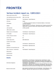 FRONT=ZX Serious incident report no. 12893/2021 Report date and time (UTC) Last modification date and time (UTC) Reporting entity/function SIR Status SIR Category Subject Joint operation JORA incident number Original source of information FX SI Handler Frontex resources involved Use of force Incident dates (UTC) Location of the incident Latitude Longitude Reference to the operational area Type of resources / involvement Dead persons Injured persons Missing persons Details Information/allegations Measures/actions taken 2021-08-10 10:25 2021-12-10 17:06 Text Removed - Human Resources Closed 1 - Situations of potential violations of Fundamental Rights or international protection obligations Alleged Violation of Text Removed - Operational Area 5 migrants prevented from illegal border crossing from Belarus after being intercepted in Lithuanian soil JO FOA Land 2021 Text Removed - Human Resources Text Removed - Human Resources Yes No 2021-08-05 03:35 Text Removed - Operational Area Text Removed - Operational Area Yes Text Removed - Human Resources On 05.08.2021, at Text Removed - Reporting Tools, Text Removed - Human Resources operating in Lithuania, intercepted five migrants (Iraqi passports) in the proximity of Text Removed - Operational Area The group was handed over to Text Removed - Human Resources. Text Removed - Reporting Tools reported the same group detected in the same day and time in Lithuanian soil, at coordinates Text Removed - Operational Area, specifying that they were prevented from illegal border crossing from Belarus. Upon request for clarification from the Text Removed - Human Resources, Text Removed - Reporting Tools reported that the incident was categorized as