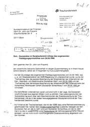 nal y 7A Treuhandanstalt r h ö F t s r o H Dr. s e d n a t s r o V Mitglied des Detlev-Rohwedder-Haus Eingang am 27. LeipzigerStraße 5-7 10100 Berlin ng Juni 1994 Büro AL . IMArT, TTeleleexfax030530141/31cha54zd-2542eYan vu Bundesministerium der Finanzen s & Eingenansen 53111 Bonn 2. LT. jumig varca ( \C_ \ u & —, 97 / vd Berlin, 4. yuni u: UAL VL _ b y le FE, (wur) 2 Alu ,? 1% | | HerrnDr.JohnvonFreyend Graurheindorfer Str. 8 G Telefon 030/31 54-2501 N ze er A “ u Betr.: Sozialpläne im Bergbaubereichinfolge des sogenannten Festlegungsprotokolles vom 24.04.1990 Sehr geehrter Herr Dr. John von Freyend, der wesentliche relevante Sachverhalt im obigen Zusammenhang ist in Ihrem Hause bereits bekannt, daher sei im folgenden nur kurz zusammengefaßt: - Auf der Grundlage des sogenannten Festlegungsprotokolles vom 24.09.1990, das "u. a. von Staatssekretären der DDR-Regierung mit unterzeichnet wurde, wurde der "Tarifvertrag über die soziale Absicherung der Arbeitnehmer der Unternehmen der Kali-, Steinsalz- und Spatindustrie (Sozialplan Kali)" vom 29.09.1990 und der "Tarifvertrag über die soziale Absicherung der Arbeitnehmer des Unternehmens der Schachtbau Nordhausen GmbH(Sozialplan Schachtbau) vom 28.09.1990ge- schlossen. - Die betroffenen Unternehmen waren und sind nicht in der Lage, die Sozialplan- verpflichtungen aus eigenen Mitteln (voll) zu erfüllen. Das Leistungsvolumen der. Sozialpläne lag auch über dem Maximalvolumen der Zweckzuwendung der Treu- handanstalt, wie es in der später herausgegebenen Sozialplanrichtlinie der Treu- handanstalt bestimmt wurde. - Auf Initiative der Treuhandanstalt‘ die mit der IGBE dazu eine Rahmenvereinbarung geschlossen hat, kamen dann Änderungstarifverträge zustande, bezogen auf den eo IV f& Sozialplan Kali am 28.10.1991 und zum Sozialplan Schachtbau am 03.12.1991. Darin wurde im wesentlichen eine Teilstundung der Abfindungsansprüche insoweit geregelt, wie sie nicht durch richtliniengemäße Zweckzuwendung abgedeckt wer- den konnten. Lu v.®n