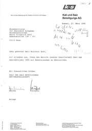 [ 781) £ L2T <ali und Salz Beteiligungs AG, Postfach 10 20 29, D-34111 Kassel Kali und Salz - Beteiligungs AG Kassel, besondere Friedrich Adenauerallee 53113 Bohl 139 - 1996 un N-AR -1996 5 2ÄHB(eodr®) Aufgaben Bundeskanzleramt Herrn März HU Bundesminister für 27. Ku ad 141 Bonn 3 / ' Q MN, Sehr wir geehrter erlauben Herr uns, Geschäftsjahr Mit KALI UND Ihnen 1995 freundlichen SALZ Minister zur den Bohl, Bericht Kenntnisnahme unserer zu Gesellschaft über das überreichen. Grüßen BETEILIGUNGS AKTIENGESELLSCHAFT A aiVar ( Ural n 5 Bethke Schäfer Anlage VN14RP7,9/0H4dr Friedrich-Ebert-Straße 160 Bankverbindung: D-34119 Kassel Kali Bank GmbH Kassel Telefon: (0561) 301-0 . Telefax: (0561) 301-1702 Stz der Gesellschaft: Kassel Registergericht: Kassel (HRB 2669) Telex: 99632 wuk d Teletex: (17) 561898=wuk Telegrammadresse: Kalsalz (BLZ 520 200 00) Konto 77 001 Aufsichtsratsvorsitzender: Gerhard R. Wolf Vorstand: Ralf Bethke, Vors., Axel Hollstein, Volker Schäfer, Hans Schneider Kassel
