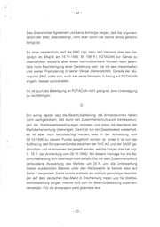 l a w A - S r W r e d n e ib e r h c S l Haiyag aus o » a d a u - 0 2 - Vom 24.1.97 . r b u a l c k a d n i T , d r a able b 2. Delhi - zösisches Staatsunternehmen, das besonderen rechtlichen und ökonomi- schen Regeln unterliegt. Ein wesentlicher Teil ihrer Tätigkeit besteht in der Gewinnung und im Vertrieb von Kaliprodukten. Die beiden der EMC- Gruppe gehörenden Kaliminen im Elsaß werden von der MDPA (Mines de Potasse d'’Alsace), einer 100 %igen Beteiligungsgesellschaft der EMC be- trieben. Der Vertrieb erfolgt über die amtsbekannte SCPA. Die Kali-Pro- duktion der MDPA ist hoch defizitär; die entstandenen Verluste wurden zum Teil durch Beihilfen des französischen Staates ausgeglichen, die als Regionalbeihilfe an die MDPA gegeben worden sind. Laut den EMC-Ge- schäftsberichten für 1994 und 1995 werden sich die Beihilfen bis ein- schließlich 1997 auf insgesamt 1,25 Mrd. FF belaufen. Anders als es die Beschlußabteilung darstellt, ist EMC/SCPA nicht nur "historisch Monopolanbieterin auf dem französischen Markt gewesen" - sie ist es heute noch, denn nach dem französischen Recht steht ihr nach wie vor das Importmonopol für nicht im freien Verkehr der EG befindliches Kali zu. Sie vertreibt daher in Frankreich nicht für ausländische Kalianbieter, sondern sie kauft diese Ware zur. Komplettierung des Eigenangebots zu. Durch diese in der EG einzigartige Stellung hat sie einen erheblichen Wettbewerbsvorsprung gegenüber anderen, dessen Berechtigung man füglich bezweifeln darf. Wie auch immer: Die EMC-Gruppe ist nicht so schwach, wie sie in den Ausführungender Beschlußabteilung erscheint. Einer Richtigstellung bedürfen auch die Mutmaßungen zu der möglichen Auswirkung einer Beteiligung der PCS auf die POTACAN. Zu diesem Zwecke fügen wir als -Anlage 24- das "Shareholder Agreement" zwischen EMC und Kali und Salz Beteili- gungs AG vom 11.12.1995 bei. Diese Vereinbarung ist das Ergebnis fast zwei Jahre andauernder Verhandlungen zwischen EMC und Kali und Salz und beider Gesellschafter mit der EG-Kommission. Mit ihr sollte einerseits eine befriedigende Lösung in dem Verfahren Nr. |V/34.7774 der EG-Kom- mission zu POTACAN gefunden und andererseits sollten die Erwartungen -21 -