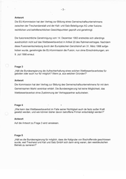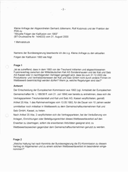 Kleine Anfrage der Abgeordneten Gerhard Jüttemann, Rolf Kutzmutz und der Fraktion der PDS zu "Aktuelle Folgen der Kalifusion von 1993" (BT-Drucksache Nr. 14/4033) vom 31. August 2000 1 Mehrabdruck Namens der Bundesregierung beantworte ich die o.g. Kleine Anfrage zu den aktuellen Folgen der Kalifusion 1993 wie folgt: Frage 1 „Ist es zutreffend, dass in dem 1993 von der Treuhand initiierten und abgeschlossenen Fusionsvertrag zwischen der Mitteldeutschen Kali AG Sondershausen und der Kali und Salz AG Kassel oder in nachfolgenden Verträgen geregelt wird, dass bis zum 31.12.2003 die Produktions- und Vertriebsinteressen der Kali und Salz GmbH nicht durch andere Firmen im Wettbewerb beeinträchtigt werden dürfen? Wenn ja, welche Regelungen sind das?“ Antwort Der Entscheidung der Europäischen Kommission aus 1993 (vgl. Amtsblatt der Europäischen Gemeinschaften Nr. L 186/38 ff. vom 21. Juli 1994) war bereits zu entnehmen, dass sich die Vertragsparteien Treuhandanstalt und Kali und Salz AG, Kassel verpflichteten, gemäß Artikel 20 Abs. 1 des Rahmenvertrages vom 13.05.1993, für die Dauer von 10 Jahren weder unmittelbar noch mittelbar in Wettbewerb zu dem Gemeinschaftsunternehmen Kali und Salz GmbH, Kassel, zu treten. Nach Artikel 20 Abs. 2 verpflichteten sich die Vertragsparteien, bei der Veräußerung von Anlagen, Einrichtungen oder Beteiligungsrechten dieses Wettbewerbsverbot auf den Erwerber zu übertragen, sofern die erworbenen Aktivitäten geeignet sind, zu Wettbewerbszwecken gegenüber dem Gemeinschaftsunternehmen genutzt zu werden. Frage 2 „Welche Haltung hat nach Kenntnis der Bundesregierung die EU-Kommission zu diesem Vertrag im Allgemeinen und zu einem solchen Wettbewerbsverbot im besonderen einge- nommen?"