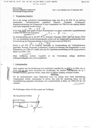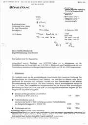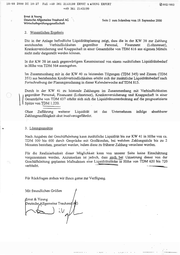 19/09 2000 DI 10:27 FAX +49 361 2143199 ERNST u KOUNG ERFURT +49 361 21 002/003 2143199 Ernst & Young Deuische Allgemeine Treuhand AG \ Seite 2 zum Schreiben vom 19. September 2000 Wirtschaftsprüfungsgesellschaft 2. Wesentliches Erszebnis Die in der Anlage befindliche Liquiditätsplanung zeigt, dass die in der KW 38 zur Zahlung anstchenden Verbindlichkeiten gegenüber Personal, Finanzamt (Lohnsteuer), Krankenversicherung und Knappschall in einer Gesamthöhe von TDM 616 aus eigenen Mitteln nicht mehr dargestellt werden können. In der KW 38 ist nach gegenwärtigem Kenntnisstand von einem zusätzlichen Liquiditätsbedarf in Höhe von TDM 564 auszugehen. Im Zusammenhang mit in der KW 40 zu leistenden Tilgungen (TDM 345) und Zinsen (TDM 351) aus bestehenden Kreditverbindlichkeiten erhöht sich der zusätzliche Liquiditätsbedarf nach Fortschreibung der Planungsrechnungin dieser Kalenderwoche auf TDM 813. Durch in der KW 41 zu leistende Zahlungen im Zusammenhang mit Verbindlichkeiten gegenüber Personal, Finanzamt (Lohnsteucr), Krankeuversicherung und Knappschaft in einer —— — Gesamthöhe von TDM 637 erhöht sich sich die Liquiditätsunterdeckung auf die prognostizierte Spitze von TDM 1.220. Ohne Zuführung weiterer Liquidität ist das Unternehmen infolge absehbarer Zahlungsunfähigkeit akut insolvenzgefährdet. 3. Lösungsansätze Nach Angaben der Geschäftsleitung kann zusätzliche Liquidität bis zur KW Al in Höhe von ca. TDM 500 bis 600 durch Gespräche mit Großkunden, bei welchen Zahlungszicle bis zu 2 Monaten bestehen, generiert werden, indem diese zu früherer Zahlung veranlasst werden. Für dic Realisierbarkeit dieser Möglichkeit kann von unserer Seite keine Einschätzung vorgenommen werden. Anzumerken ist jedoch, dass auch bei Umsetzung dieser von der Geschäftsleitung geplanten Maßnahnen eine Liquiditätslücke in Höhe von TDM 620 bis 720 verbleibt. NT ii Für Rückfragen stehen wir Ihncn gerne zur Verfügung. Mit freundlichen Grüßen mst & Young eutsche Allgemeine Treuhan UV.