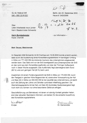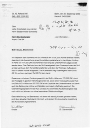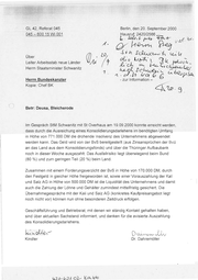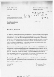 GL 42, Referat 045 | 045 - 600 15 Wi 004 | Berlin, danz: September2000.-— Hausruf: 2420/2566 De I:102wer R6% Über | E20 = © .d . h r « a LeiteAr rbeitsstabneueLänder U | 4 g I 10.95 Herrn Staatsminister Schwanitz Herrn Bundeskanzler - zur Information - Kopie: Chef BK = Betr: Deusa, Bleicherode 1 = Im Gespräch StM Schwanitz mit St Overhaus am 19.09.2000 konnteerreicht werden, dass durch die Ausreichung eines Konsolidierungsdarlehens im benötigten Umfang in Höhe von 771.000 DM die drohende Insolvenz des Unternehmens abgewendet werden kann. Das Geld wird von der BvS bereitgestellt (aus Zinsansprüchen der BvS an das Land aus dem Konsolidierungsfonds) und über die Thüringer Aufpaubank noch in dieser Woche ausgezahlt. Das Ausfallrisiko liegt überwiegend beim Bund (80 %) und zum geringen Teil (20 %) beim Land. Zusammenmit einem Forderungsverzicht der BvS in Höhe von 170.000 DM, durch den Festgeld in gleicher Höhe freigeworden ist, sowie einer Vorauszahlung der Kali und Salz AG in Höhe von 500.000 DM ist die Liquidität des Unternehmensund damit auch'die Zahlung der Löhne’ und Gehälter zumindest mittelfristig gesichert. Die Übernahmegespräche mit der Kali und Salz AG (konkretes Kaufpreisangebotliegt noch nicht vor) können nun ohne besonderenZeitdruck erfolgen. Geschäftsführung und Betriebsrat, mit denen wir ständig Kontakt gehalten haben, sind über aktuellen Sachstand informiert, und danken für die avisierte Auszahlung des Konsolidierungsdarlehens. I uinoler Kindler Den = - in 102 - rach Dr. Dahremöller