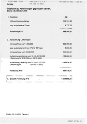 31-0KT-2008 16:51 .DEUSA BMWI BLNVUIC3 A +49 1888 615 5363 S.83703 +49 1888 615 5363 Übersicht zu Forderungen gegenüber DEUSA Stand: 30. Oktober 2000 1. Darlehen DM 556.231,26 Offener Darlehensbetrag zzgl. aufgelaufene Zinsen 9.737,05 Forderung K+S 2. 565,968,31 Abrechnung Lieferungen Vorauszahlung vom 1.09.2000 zzgl. aufgelaufene Zinsen (7% für 60 Tage) Vorauszahlung vom 29.09.2000 Aufrechnung Lieferung vom 16.10.-20.10.2000 . 500.000,00 5.830,86 300.000,00 -168.888,45 (Rechnung Nr. 0101126 vom 23.10.2000) Aufrechnung Lieferung vom 23.10.-27.10.2000 (Rechnung Nr. Forderung K+S 3, Gesamt-Forderung K+S -143.824,40 vom 30.10.2000) '493.118,01 1.059.086,32 rien RB-Bn, 30.10.2000, Deusa10 GESAMT SEITEN 83