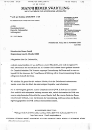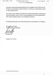 B6-NOV-2000 20:20 MANNHE IMER SWARTLINCA Ffm +49 69 7410143 +49 69 7410 14I3RSWARTLING Wesentlich weniger problematisch gestalteten sich die Gespräche mit der TEAG sowie der DG-Bank; auch dort könnte es jedoch sicherlich von Vorteil sein, wenn Ihrerseits ein positi- ves Signal erfolgen könnte. Des weiteren wurden zahlreiche Gespräche mit den finanzierenden Banken sowie Hanson & Möhring AB geführt, welche zu dem als Anlage beigefügten Letter of Intent geführt haben. Über weitere Fortschritte werden wir Sie unmittelbar unterrichten. "Für Rückfragen stehen Ihnen der Unterzeichnerjederzeit, auch telefonisch, zur Verfügung Mit freyfidlichen Grüßen MANNHEIMER Andreas SWARTLING Kat Rechtsanwalt Anlage: Letter of Intent LAD\DeusalOptiongrachnKanzieramt_08112000.doc Ss.83