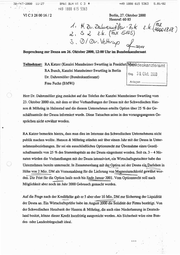 3a-MKT-2008 11:27 BMWI BLN VIC3 A +49 1888 615 5363 S.B1/22 +49 1888 615 5363 VIC3280016/2 Berlin, 27. Oktober 2000 Hausruf: 60 85 gg R [E h a h C e fe iö en w ul D d H A 282 &k (ix x &108) (00184) 3. D/O. Velo 72.7 BesprechungzurDeusaam26.Oktober2000,12:00UhrimBundeskanzleramt Teilnehmer: RA Katzer (Kanzlei Mannheimer Swartling in Frankfurt/Main)eskanz!srat RA Busch, Kanzlei Mannheimer Swartling in Berlin Dr. Dahremöller (Bundeskanzleramt) eenr|are: ap Eng SUUKT ZE “ ü Frau Fuchs (BMWi) N " | i Artiawesm PEN urn. ee 23. Oktober 2000 ein, mit dem er über Verhandlungen der Deusa mit der Schwedischen Han- son & Möhring in Halmstad und die diesem Unternehmenerteilte Option über 25 % der Ge- schäftsanteile der Deusa informiert wurde. Diese Tatsachen seien in den vorangegangenen Ge- sprächen nicht erwähnt worden. RA Katzer bemerktehierzu,dass man dies im Interesse des Schwedischen Unternehmensnicht publik machen wollte. Hanson & Möhring stünden seit über einem Jahr mit der Deusa in Unter- nehmensbeziehungen. Ihr sei ein ausschließliches Optionsrecht zur Übernahmeeines Gesell- schaftsanteils von 25 % des Stammkapitals an der Deusa eingeräumt worden. Seit ca. 3-4 Mo- naten würden die Verhandlungen mit der Deusaintensiviert, ein Wirtschaftsgutachter habe das Unternehmen bereits untersucht. In Zusammenhang mit derOption sei der Deusa can Darlehen in t BE EM alsVorauszahlungfürdie LieferungvonMagnesiumchloridgewährtwor- den. Die Frist für die Option laufe noch bis Ende Januar 2001. Vom Optionsrecht Ball nach nn e T Möglichkeit aber noch im Jahr 2000 Gebrauch gemacht werden. Auf die Frage nach der Kredithöhe gab er 5 aber eher 10 Mio. DM zur Sicherung der Liquidität die der Deusa an. Ein Wirtschaftsprüfer habe im August2000 Solidität der Firma bestätigt. Von der Schwedischen Hausbank der Hanson & Möhring, die auch eine Niederlassung in Deutsch- land besitzt, könne dieser Kredit kurzfristig ausgereicht werden. AlsSicherheit wäre eine Bun- des- oder Landesbürgschaft ideal. ! ! Herr Dr. Dahremöller ging zunächstauf das Telefax der Kanzlei Mannheimer Swartling vom —— | 4 |