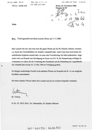 28-NOU-2208 99:53 BMWI BLNVUIC1 VIC2-2800195 . ” 493 1888 615 5364 A +43 18388 615 5364 S.01701 , Berlin, 20. November 2000 Notiz Au 7 Betr.: Telefongespräch mit Herrn Lensch, Deusa, am 17.11.2000 Herr Lenschteilt mit, dass man zwar die ganze Woche mit der Fa. Possehl, Lübeck, vertreten u.a. durch den Geschäftsführer Dr. Rudolf, verhandelt habe. Auch wenn man noch keinenab- schließendes Ergebniserreicht habe, sei man einer Vereinbarungviel näher gekommen. Ange- strebt wird von Possehl eine Beteiligung an Deusa von 25,1 %, die Finanzierung wichtiger In- vestitionen (vor allem für die Trocknung des Feuchtkali) und die Schließung der Liquiditätslü- cke. Possehl habebereits rd. 1,5 Mio. DM zur Verfügung gestellt. Im übrigen beabsichtige Possehl in der nächsten Wocheein Gespräch mit K + S, um mögliche Konflikte auszuräumen. Für Mitte nächster Woche haben Herr Lensch und ich ein weiteres Gespräch vereinbart. Dr. Veltrup D/ S2, VI, VIC3, HIA7, Dr. Dahremöller, Dr. Kindler (BKamt) GESAMT SEITEN 81 Yan — 621 OR- ka 66 l00