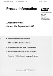 24.NOV, 28080 18:51 K+5 KOMMUNIKATION ki NR. 253 Presse-Information 5.177 2.87 K+S Aktiengesellschaft 24.11.2000 O-Gö/Ro Ulrich Göbel (0561) 301-1722 ulrich.goebel@kalisalz.de Zwischenbericht Januar bis September 2000 e K+S-Gruppe mit starkem Wachstum e EBIT mit 105 Mio. € auf Rekordniveau e Ergebnis pro Aktie (DVFA) auf 1,33 € gestiegen | e Ergebnis 2000 wird Vorjahr deutlich übertreffen «e Geplantes Joint Venture soll Salzgeschäft stärken Kommunikation » Postfach 102029 » 34111 Kassel Telefon (05 61) 3 01-17 22 » Telefax: (05 61) 3 01-16 66 \ \