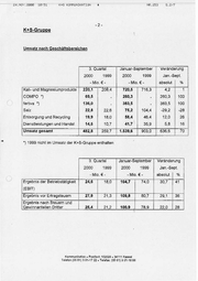 24.NOY,. 2000 18:51 K+S5 KOMMUNIKATION K+S-Gruppe 4 NR. 253 1 SIE AR | Umsatz nach Geschäftsbereichen | 3, Quartal 2000 Januar-September 1999 | -Mio. € - | Kali- und Magnesiumprodukte 220,1 1999 -Mio, € - 208,4 | COMPO *) 69,5 fertiva *) 2000 Veränderung Jan.-Sept. absolut % 720,5 716,3 4,2 1 260,3 . 260,3 100 136,0 j 383,5 ß 383,5 100 Salz 22,8 22,6 75,2 104,4 -29,2 -28 Entsorgung und Recycling 19,9 18,0 58,4 46,4 12,0 26 Dienstleistungen und Handel 14,5 10,7 41,7 35,9 5,8 16 482,8 259,7 1.539,6 903,0 636,6 70 Umsatz gesamt “) 1999 nicht im Umsatz der K+S-Gruppe enthalten | 3. Quartal 2000 1999 | -Mio. € - Ergebnis der Betriebstätigkeit Januar-September 2000 1999 -Mio. € - Veränderung Jan.-Sept. absolut % 24,6 18,0 104,7 74,0 30,7 1741 27,9 21,3 109,8 80,7 29,1 36 25,4 2172 100,9 789 22. 0.4122B (EBIT) Ergebnis vor Ertragsteuern Ergebnis nach Steuern und Gewinnanteilen Dritter | \ Kommunlkatlon Postfach 102029 » 34111 Kassel Telefon (05 61) 3 01-17 22 . Telafax: (05 61) 3 01-16 66
