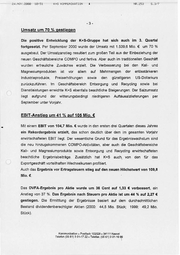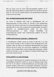 2d,NOV. 2000 18:51 K+S5 KOMMUNIKATION ä NR. 253 SA BP Mitte des Jahres wurde das zweite Aktienrückkaufprogramm gestartet. Am 30. September 2000 betrug der Bestand an eigenen Aktien 2.021.200 Stück, was einem Anteil von 4,49 % am Grundkapital entspricht. Der durchschnittliche Erwerbspreis beläuft sich auf 16,51 €/Aktie. Kali- und Magnesiumprodukte über Vorjahr Von Januar bis September 2000 wurde im Geschäftsbereich Kali- und Magnesiumprodukte mit einem Umsatz von 720,5 Mio. € das Vorjahresniveau übertroffen. Sehr erfreulich verläuft nach wie vor das Industriekaligeschäft. Die starke Nachfrage führte zu einer hohen Auslastung der Produktionsanlagen. Mit gezielten Maßnahmen zur Kapazitätserweiterung Wachstumsmöglichkeiten in diesem eröffnete wichtigen sich K+S Geschäftsfeld. weitere Das Düngemittelgeschäft profitierte neben Preiserhöhungen zusätzlich von der US- Dollarkursentwicklung. COMPOsetztpositiven Trend des1. Halbjahres fort Im Geschäftsbereich COMPO erreichte der Umsatz mit 260,3 Mio. € ein gutes Niveau. Bei den Produkten für Heim und Garten wurden die Marktpositionen weiter ausgebaut, Neben der Stärkung des traditionellen Markengeschäfts durch gezielte Werbung und Service wurden auch neue Kunden hinzugewonnen. Im Profibereich konnten in allen wichtigen Märkten deutliche Steigerungen erzielt werden. COMPO profitiert hier besonders von den neu eingeführten innovativen ENTEC-Düngem, die einen hohen Zuwachs erreichten. | \ fertiva_ profitiert von quter Nachfrage fertiva setzte im Berichtsquartal ihre erfolgreiche Entwicklung fort, Der Umsatz mit Stickstoffhaltigen Düngemitteln erreichte von Januar bis September dieses Jahres 383,5 Mio. €. Die Verkäufe von Mehrnährstoffdüngern und Ammonsulfat wurden gesteigert; zusätzlich profitierte fertiva vom günstigeren US-Dollarkurs. In Europaist es nach langer Zeit wieder gelungen, die bislang niedrigen Preise für stickstoffhaltige Kommunikation « Postfach 102029 = 34111 Kassel Telefon (05 61) 3 01-17 22 » Telefax: (05 61) 3 01-16 66