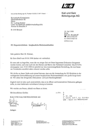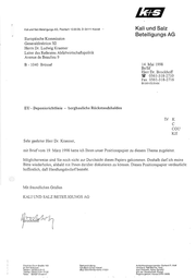 LZ27 Kali und Salz BeteiligungsAG, Postfach 102029, D-34111 Kassel - Kali und Salz Beteiligungs AG Europäische Kommission Generaldirektion XI Herrn Dr. Ludwig Kraemer Leiter des Referates Abfallwirtschaftspolitik Avenue de Beaulieu 9 B - 1040 Brüssel 14. Mai 1998 Br/Sf Herr Dr. Brockhoff & 0561-318-2710 Fax 0561-318-2716 B1205-EU.SAM EU - Deponierichtlinie - bergbauliche Rückstandshalden D/ K COU KJJ Sehr geehrter Herr Dr. Kraeiner, mit Brief vom 19. März 1998 hatte ich Ihnen unser Positionspapier zu diesem Thema zugeleitet. Mösglicherweise sind Sie noch nicht zur Durchsicht dieses Papiers gekommen. Deshalb darf ch meine Bitte wiederholen, alsbald mit Ihnen darüber diskutieren zu können. Dieses Positionspapier verdeutlicht hoffentlich, daß Handlungsbedarf besteht. Mit freundlichen Grüßen KALI UND SALZ BETEILIGUNGS AG anr | Friedrich-Ebert-Straße 160 D-34119 Kassel Telefon: (0561) 501-0 Telefax: (0561) 301-1702 Telex: 99632-0 wuk d Bankverbindung: Kali-Bank GmbH Kassel {BLZ 520 200 00) Konto 77001 Aufsichtsratsvorsitzender: Gerhard R. Wolf Vorstand: Ralf Bethke, Vors., Axel Holistein, Volker Schäfer Sitz der Gesellschaft: Kassel Registergericht: Kassel (HRB 2669)