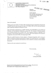 15 JUNI 1998 | EUROPEAN COMMISSION “ DIRECTORATE-GENERAL XI ENVIRONMENT, NUCLEAR SAFETYAND CIVIL PROTECTION Directorate E - Industry and environment Xl.E.3 - Waste management‘ 09) u 08 Brussels; - 5.987. X,0087 XI-E3/LK D(97) Mr Brockhoff Kali und Salz BeteiligingsAG Friedrich-Ebert-Strasse 160 D-34119 Kassel Germany Dear Mr Brockhoff, Thank youfor yourletter of 14 May 1998 conceming the new Commission Proposalfor a landfill Directive and your previousletter of 19 March 1998 with the enclosed position paper regarding underground disposal.of waste. The Commission Proposal for a Landfill Directive was transmitted to the Council of Ministers and the European Parliament in April 1997. The Council of Ministers agreed on a Common Position on 23 March 1998. This Common Position is expected to be discussed in the European Parliament in the autumn 1998. Final adoption of the Directive is expected in the end of 1998 or the beginning of 1999. Whenthe landfill Directive is finally adopted, a Technical Committee will be set up, in order to finalise the technical requirements in Annex I-III ofthe Directive. I am confident that your specific comments and information will be useful for inclusion n these detailed discussions, Thank you for your constructive contribution. Yours sincerely, Lay Ludwig KRÄMER Rue de la Loi 200, B-1049 BruxellesWetstraat 200, B-1049 Brussel- Belgium - Office: BU 9 2/167. Telephone: direct line (+32-2)299.22.65, exchange 299.11.11. Fax: 299.10.68. Telex: COMEU B 21877. Telegraphic address: COMEUÜR Brussels.