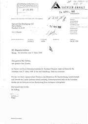 FT M Ur. Vprcl et) K/IE- T ara SACHSEN-ANHALT 8 9 9 1 _ L I R 34, AP Staatskanzlei Siaatskanzlei des Landes Sachsen-Anhalt Posfach 4160 " 39 016 Magdeburg Domplotz 4 39104 Mogdeburg TEL 0291) 567 01 Kal und Salz Beteiligungs AG 91 Herrn Bethke Postfach 10 20 29 EEE FAX 10391) 547 6545 doril v£ A OR Londeshaupikasse Lonceszentralbonk 2 Ihr Zeichen, Ihre Nachricht vom Mein Zeichen 25/3021 NL Tel (0391) 587: KTO 810015 18 beorbeilet von; Mogdeburg, 6658 EU-Deponierichtlinie Bezue: BLZ81000000 LA a 34111 Kassel 06.04.1998 {\ Ihr Schreiben vom 27. März 1998 Sehr geehrter Herr Bethke, sehr geehrter Herr Schäfer, im Namen von Herrn Ministerpräsidenten Dr. Reinhard Höppner danke ch Ihnenfür Ihr Schreiben vom 27. März 1998. Er hat mich beauftragt, Ihnen zu antworten. Für das von Ihnen angesprochene Thema ist das Ministerium für Raumordnung, Landwirtschaft und Umwelt des Landes Sachsen-Anhalt zuständig. Dementsprechend habech dorthin mit der Bitte um weitere Bearbeitung Ihres Anliegens weitergeleitet. Mit freundlichen Grüßen Im Auftrag ST “ el un IN Traus Gedrucki auf Umweltpopier Ihr Schreiben