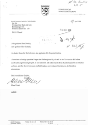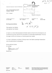 De Bet fl u jo I/E-T e a m. N ar Niedersächsische Staatskanzlei . Postfach 2 23. 30002 Hannover | \ Kali und Salz BeteiligungsAG Postfach 102029 | N. rn i 3 | ER > . NE ei Ri ” . Niedersächsische BIN n ar \ Ein 32 DT namen | ö 34111 Kassel TITTTT i u Bearbeite!vonFrau Bauseneick Ihr Zeichen, Ihre Nachricht vom Mein Zeichen (Bei Antwort angeben) Durchwahl (05 11) 120- Hannover 27.03.1998 104 - 72520/1 6939 09.04.1998 EU-Deponierichtlinie SehrgeehrterHerrBethke, An —!/ FH K EIA sehr geehrter Herr Schäfer, im Namen von Herrn Ministerpräsident Schröder danke ich Ihnen für Ihre Informationen und die Übersendung einer Abschrift Ihres Schreibens an die Bundesumweltministerin. Ihre Aus- führungen sind hier mit Interesse zur Kenntnis genommen worden. Ich habe Ihr Schreiben zur näheren Prüfung an das in der Sache zuständige Niedersächsi- sche Umweltministerium weitergeleitet. Mit freundlichen Grüßen Im Auftrage a 2000 Bauseneick Dienstgebäude Telefon Telex Paketanschrift Überweisungen an Niedersächsische Landeshauptkasse Hannover Planckstraße 2 (05 11) 120-0 923414-Onld Planckstraße 2 Konto-Nr. 250 015 67 Landeszentralbank Hannover (BLZ 250 000 00) Hannover Telefax 30169 Hanncver Konto-Nr. 101 359 271 Nordd, Landesbank Hannover (8L2 250 500 09) (05 11) 1 20-63 30 deponie.doc Konto-Nr. 90-304 PGircA Han (BLZ 250 100 30)
