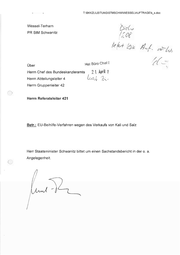 TABKKZL\LEITUNG\STMSCHW\WESSEL\AUFTRAGEN\kK_s.doc Wessel-Terharn Kr er 2 PR StM Schwanitz /£ OD £ oh Ef Über f e h C o r ü B Hai Herrn Chef des Bundeskanzleramts Herrn Abteilungsleiter 4 2 April I lvo A Herrn Gruppenleiter 42 Herrn Referatsleiter 421 Betr.: EU-Beihilfe-Verfahren wegen des Verkaufs von Kali und Salz Herr Staatsminister Schwanitz bittet um einen Sachstandsbericht in der 0. a. Angelegenheit. Pi