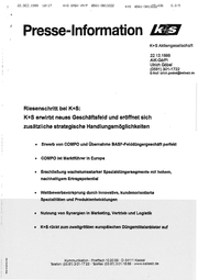 22.DEZ.1993 18:17 K+S GMEH VM/P 95561-3013222 Ks 0561-21 3332436 S-275 Presse-Information 23 K+S Aktiengesellschaft 22.12.1999 A\K-Gö/Pi Ulrich Göbel (0561) 301-1722 E-Mall: uiricen.goebei®kaljsaiz.de Riesenschritt bei K+S: K+S erwirbt neues Geschäftsfeld und eröffnet sich zusätzliche strategische Handlungsmöglichkeiten e Erwerb von COMPO und Übernahme BASF-Felddüngergeschäft perfekt e COMPOIst Marktführer In Europa e Erschließung wachstumsstarker Spezlaldüngersegmente mit hohem, nachhaltigem Ertragspotential « Wettbewerbsvorsprung durch innovative, kundenorlentlerte Spezialitäten und Produktentwicklungen RAYWINTEIZN e Nutzung von Synergien in Marketing, Vertrieb und Logistik e K+Srückt zum zweitgrößten europäischen Düngemittelanbieter auf Kommunikation - Postfach 1020 29 - D-34111 Kassel Telefon: (05 81) 301-1722 - Telefax: (05 61) 301-1666 - www.kallsalz.de