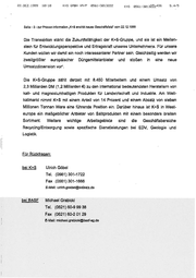 22.DEZ.1999 18:18 K+S GMBH VM/P 8561-3213222 K+sS B561-201335>2435 8.45 Seite - 3- zur Presse-Information „K+S erwirbt neues Geschäftsfeld" vom 22.12.1999 Die Transaktion stärkt die Zukunftsfähigkeit der K+S-Gruppe, und sie ist ein Meilen- stein für Entwicklungsperspektive und Ertragskraft unseres Unternehmens. Für unsere Kunden wallen wir damit ein noch interessanterer Partner sein. Gleichzeitig werden wir zweitgrößter europäischer Düngemittelanbieter und stoßen in eine neue Umsatzdimension vor“. Die K+S-Gruppe zählt derzeit mit 8.450 Mitarbeitern und einem Umsatz von 2,3 Milliarden DM (1,2 Milliarden €) zu den international bedeutendsten Herstellern von kali- und magnesiumhaltigen Produkten für Landwirtschaft und Industrie. Am Welt- kalimarkt nimmt KrS mit einem Anteil von 14 Prozent und einem Absatz von sieben Millionen Tonnen Ware eine führende Position ein. Darüber hinaus ist K+S in West- europa ein mafßgeblicher Anbieter von Salzprodukten mit einem besonders breiten Sortiment. Weitere wichtige Arbeitsgebistte sind die Geschäftsbereiche Recyeling/Entsorgung sowie spezifische Dienstleistungen bei EDV, Geologie und Logistik. Für Rückfragen: bei K+S Ulrich Göbel Tel. (0561) 301-1722 Fax (0561) 301-1666 E-Mall: ulrich.‚goebel@kalisalz.de ei BAS Michael Grabicki Tel. (0621) 60-9 99 38 Fax (0621) 60-2 01 29 E-Mail: michaei.grabicki@basf-ag.de