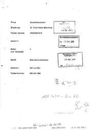 | Firma: Bundeskanzleramt - Empfärger! Dr. Frank-Walter Steinmeier | Telefax Nummer: 433040001818 Bir _ Staats Kater 2 2000 18 1. | Bundeskanzleramt Abschrift: Eing 1A März 2000 Anlagen EPDEAEUUREUUTPTInnmammgmmnaygddd Seiten: & i (inkl. Deckblatt) Bundeskanzierarn1 Posteingan.; Al « Betreff: Bitte sofort weiterleiten | i | 20. März ZUül n e n n a b a an: G Absendar: Kaliurd Salz Telefax-Nummer: 056 18011666 88985 LUST ZNONSS.INDE } % LAWAFTZNWISIONNG CH:0l 0007 uw 'Zl