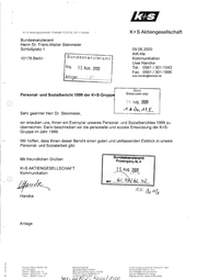 L2T7 K+S Aktiengesellschaft, Postfach 102029, 34111 Kassel K+S Aktiengesellschaft Bundeskanzleramt Herrn Dr. Frank-Walter Steinmeier Schloßplatz 1 10178Berlin 09.08.2000 A\K-Ha | Bundeskanzierami| | | lem. 12 Au m Eu r Uwe Handke Tel.: 0561 / 301-1043 | Fax: 0561 / 301-1666 | uwe.handke@kalisalz.de | Anlegen... VE Kommunikation an aE chtageia d Ä DAT Süro ZE a IA Personal- und Sozialbericht 1999 der K+S-Gruppe | LE Silaatssekretär | h . Aug, 2000 , LE A M A A | armen Sehr geehrter Herr Dr. Steinmeier, BT Ems TER TO on Dane Ei na man wir erlauben uns, Ihnen ein Exemplar unseres Personal- und Sozialberichtes 1999 zu überreichen. Darin beschreiben wir die personelle und soziale Entwicklung der K+S- Gruppe im Jahr 1999. Wir hoffen, dass Ihnen dieser Bericht einen guten und umfassenden Einblick in unsere Personal- und Sozialarbeit gibt. Mit freundlichen Grüßen a pLanzioram K+S AKTIENGESELLSCHAFT 45 Aug, 2 0 Kommunikation zn fe de AN, an..L . ASL 2, AU. 8017, Handke Anlage R1FA7IS0OD4VN Friednch-Ebert-Straße 160 Bankverbindung: Aufsichtsratsvorsitzender: Gernard R. Wolf 34119 Kassel Wntershall Vorstand: Ralf Bethke, Voes,, Teleton: (0561) 30-0 Telefax: (06561) 301-*753 Telex: 996532-0 wuk d {BLZ 520 200 00) Konto 770019 S.WIFT.-Code: WINB DE 51 va GENO DE FI: 200 _ \ Banx GmbH Axel Hollstein, Norbert Steinsr Stz der Gesellschaft: Kassel In WA- RO D barcl tro0 Regstergercht: Kassel (HRB 2668)