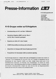 1B8.AUG.2BBR 98:40 K+S5 KOMMUNIKATION ä NR.487 Se: Presse-Information 223 K+S Aktiengesellschaft 10.08.2000 A\K-Gö/Pi Ulrich Göbel (0561) 301-1722 E-Mall: ulrich.goebel@kallsalz,de K+S-Gruppe weiter auf Erfolgskurs Umsatzanstieg um 64 % auf über 1 Milliarde € e Operatives Ergebnis (EBIT) um 24,1 Mio. € auf 80,1 Mio. € deutlich gesteigert se Ergebnis pro Aktie 42 % über Vorjahr »e COMPO-Geschäftsentwicklung sehr erfreulich e Akquisition im Salzgeschäft ideale Ergänzung für K+S e Perspektiven für Gesamtjahr 2000 unverändert günstig . Die K+S-Gruppe steuerte im 1. Halbjahr 2000 weiter auf Erfolgskurs und erzielte einen Umsatz von 1.056,8 Mio. €, Der Umsatzanstieg um 413,5 Mio. € bzw. 64 % resultiert im Wesentlichen aus der Einbeziehung der neuen Segmente Geschäftsbereichen Entsorgung und COMPO und ferlva. Darüber hinaus konnte auch In den Recycling sowie Dienstleistungen und Handel der Umsatz ausgeweitet werden. Witterungsbedingt gingen die Umsätze im Salzbereich zurück, vornehrnlich durch das schwache Auftausalzgeschäft zu Beginn des Jahres. Bei den Kali- und Magnesiurnprodukten wurden das hohe Niveau des Vorjahres erneut annähernd erreicht, HIIAUOTBWN Kammunlkatlon - Postfach 102029 : D-34111 Kassel Telefon: (05 61) 301-1722 - Telefax: (05 61) 301-1666 - www.,kalisalz.de