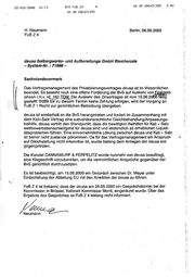 22-RUG-2u00 16:13 BUS FUB 24 493 30 206431399 i s.B2 43 38 286431399 H. Neumann Berlin, 06.06.2000 FuBZ4 oo. deusa Solbergwerke- und Aufbereitungs GmbH Bleicherode — System-Nr. : 71988 — Sachstandsvermerk | Das Vertragsmanagement des Privatisierungsvertrages deusa ist im Wesentlichen beendet. Es besteht noch eine offene Forderung der BvS auf Auskehr von Eestgeld- zinseni.H.v. rd,162.TDM. Die Auskehr des Zinsertragesist zum 15.06.2000fällig gesteilt- Sölfte Bis zu diesem Termin keine Zahlung erfolgen, wird der Vorgang an FuB Z 1 Recht zur gerichtlichen Beitreibung übergeben. M deusaist wiederholt an die BvS herangetreten und fordert im Zusammenhang mit . dem Kali+Salz-Vertrag eine subventionsrechtliche Gleichbehandlung/Anpassungs- beihilfe. deusa vertritt den Standpunkt, dass die bewilligten Beihilfen für Kali + Salz wetibewerbsbenachteiligend für deusa sind und letztendlich zu erheblichen Liquidi- tätsproblemen führen. Eine einvernehmliche Lösung zwischen deusa und Kali + Salz ist bisher nicht’zustande gekommen. Dafür das Vertragsmanagementein Anspruch . auf Gleichstellung nicht erkennbarist, wurde bislang dem Anliegen der deusaent- gegengetreten. Die. Kanzlei CANNAWURF & PERPELITZ wurde nunmehr von deusa beauftragt, eine Klageschrift vorzubereiten, um die vermeintlichen Ansprüche gegenüberder BvS gerichtlich durchzusetzen. Esist beabsichtigt, am 15.06.2000 ein Gespräch zwischen Dr.Meyer unter Einbeziehung der Abteilung EU mit den Anwälten der deusa zu führen. FuBZ4 ist bekannt, dass der deusa am 286.05.2000ein Gesprächstermin bei der Kommission in Brüssel, Kabinett Kommissar Monti, eingeräumt wurde. Über das Ergebnis des Gespräches ist FuB Z 4 bislang nicht informiert. ee GI "Neumann
