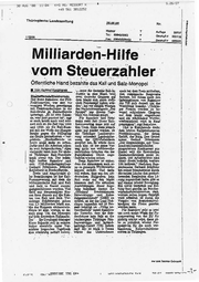 22 AUG ’aea 11:04 TAEDICH K+S AG, RESSORT K +49 561 Thüringische Landesze tun 3012252 g .25.08.00 Nr. ? ‚Weimar hr Auflage Fat: 03943208422 7 GesAuf-V .aadnas zurar 8 2 Milliarden-Hilfe vom Steuerzahler Öffentliche Handbezahlte das Kaliund Salz-Monopol BB von Hartmut Kaczrmarek Slschofferade/Bleläherode. (U2) Bodo Ramelow, der PDS- Fraktionsvize,’ war erst vor i en Wochen gemeinsam mit tonskollegen in der nass diedeutsche Kali-ka- duswise ‘in eins Hand, 'we zwei deutschs Gruppen a auch bei dem Preis mithalten, . dan rumänische Bargwerke ' fordern, bei denen nach den dem Marktsich einen bödli« Informati enen von Ramelow chen Preis f kaferm wür- ‚die TST sich derzait um das dan”, hat vor B& Wochen dag Nachrichtenmagazin „Der Spiegel" 'ans diesem Tage- KsliGrube in Bischofferode untertage. „Es ist eine Schan- "buch von Sehucht zitiert - - de, was dort passiert ist“, sagt Für Ramelow üzd Türto: er auch bouta noch und erin- mann steht fast: Dieser Kali- nert sich an die Zait von 1992 - fusionsvertrag. muss jetzt. auf "Winhtersalz bemüht. ';Thüzln- gez Firmen en so be- wusst schlechtere Chageeu auf dez Markt eingeräumi. und aln orkeblichor Wertbe- werbsnachteil wird in Kauli genatmmen", sugt Ramelow. und 1993, als die Kali-Kum- Jen Tisch, Doun danu kösum Und in Bleicherode dreht: pol mit der Waffo das Hunger- nleht nur geklärt warden, eb "dem letzten Kalipreduzeuten Stzeiks gegen die Stllogung die Tbürinzer Landastegie- . Nerdthüringezs, der deuca der Grube pratsstiarten < ver-- rung seinerzeit Landssintan . GmbH, der Ruiz, Den Grund oe „Bisehofferode ist eute nieht mehr zu retten. ‚Dafür sinddie Arbeiten schon essau der CGDU-Pareisison nennt Gerhad Jürtemanst geopfert hat. Es wilde dann ‘ „Der überrnäehtige, zuit Tzuu- auch klar. ob der Benze Vor kend-Milliardenbeikilfen nicht ‘aus wattbewerbs- zu weit fortgeschritten... Aber vielleicht kann, man für ande- { tlichen Gründen von der ® Thüringer Kali-Standozte Europäischen Union ange- 'noch stwas tun. Das Jeden- ! Tockten werden müsse, Als hoffen Romelow und Dexrn Ramelew ist sicher, sein EDS-Bundestagskollege ' dass.das Abkommen auch ei- ; Gerhard Jüttemann. frükerer ns sa genanute, Watlbewerbs« ausgastatete Konkusyent aus Kassel will die Alnanziellen Daumezschrauben zuicht lo- ckars, 102 Arbalfsplätza sind damit direkt, bedzoht, weitere 100 indirekt.“ Nachdem Bun« deskanzler Gerhard Schröder “ Betriebsrat in Bischaflarods, klassel enthält Und dern "bei seiner Sarmrmerzeise durch Dreh und Angelpuskt al- soll stehen, dass aus deu ost- die neuen Länder den protast. ben kein ieranden Bergletiten eina Lä- ler Bemühungen ist der Kali- deutschen dan Markt «sung Zugesichart hatte, gibt s5 , Fusionsvartxag, mit dem dJe .Kali mehr auf Mitteldeutsche Kali und Kali und Salz in Kassel zusam-« . mangas ehlossen wurden. Viel Geld aus Steumzahlers Kas- sen ioss damals auf die Kon-, ten von Kali und Salz. Vor giehtigs Schätzungen gehen a Milliarden Mork aus, die der Konzern ninkassierte, ‚ Beuts ist klar, worum eo da- Ex-Treuhand-Mahager lung bekommt demasit dia Sandersheusen „Glückauf tung’fand gestern iu Bundes- u zu ie spüren, an der das Land Tbd- weitere sallen folgen. Geprüft Füngspesels Kingen i mit 20 Pro» zent beteiligt ist, „Vollg an- dies eindautig notiert wütscheftsministerium atam, wird offenbar, ob durch die Yorga e‘von Bogiebemittel- kraditez die Firma gerettet „werden kan. Für Ramelow geht ss Jetzt verständlich” meant Ramelow landsseigena Thüringer Saz- and» Klaus Schucht sol] in seinem Benwartungs- und bisher ebenfalls unter Ver ‚ keltungs-GmbH (TS) liefern schluss liegenden Rh ei einmal wieder Bewegung: Auswirkungen dieser Rege-, Ein ertea GespNch zur Ret- kommen. darf. Die aktuellen mals eing: Um das Monopol die Tatsacha, dass die Seu- " aufdam deutsehen Kalümarkt, dershäuser kein Sulz an die Der‘ auf darf. Mit 50 Matk ja Tonne hahen:. würde das Ünternelimen wn nochmehr: Wiek siv von der Er ! ür | niehög örklärt wird, dann gä- | be es plötzlich wiader Per. spektivon für die noch vor bandenen Kaliproduktions- stätten in Thüringen. mr zum lAterrien Gebrauch 4 Fr2"C cd, "NIIITTGE T3S 6r+ | KINTEHSTRINLIING Sa ToceT FARARI AM Ira I