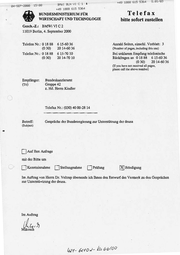 24-SEP-2eea BMWI BLN VI C1 A 15:06 3 8 0 7 1 .0 5 4 6 3 5 5 1 6 +49 1888 +49 1888 615 5364 BUNDESMINISTERIUM FÜR Gesch.-Z.: Telefax BMWi VIC2 11019 Berlin, 4. September 2000 Telefon Nr.: 01888 (030) Telefax Nr.; 01888 (030) 6 15-60 36 Anzahl Seiten, einschl. Vorblatt: 3 20 14-60 36 (Numberofpages,includingthis one) 615-7010 Bei unklarem Empfangtelefonische 2014-7010 Rückfragen an 01888 (0 30) 6 15-60 36 20 14-60 36 (I£ you have not reccivedall pages, pleasc call Ihe above number) Empfänger: Bundeskanzleramt (To) Gruppe 42 z. Hd. Herm Kindler Telefax Nr.: (030) 40 00-28 14 Betreff: Gespräche der Bundesregierung zur Unterstützung der deusa (Subject) a Auf Ihre Anfrage mitderBitteum [_]Kenntnisnahme | ]Stellungnahme [_]Präfung Erledigung Im Auftrag von Herm Dr. Veltrup übersende ich Ihnen den Entwurf des Vermerk zu den Gesprächen zur Unterstü+tzung der deusa. Im Auftrag ‚Lu N 0 0 ( 0 6 a k d O X bar- E