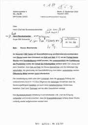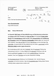 BMWI BLN VIc1 24-SEP-2uu0 15:08 +49 1888 615 5364 A S.02/83 +49 1888 615 5364 BMWi VIC2 Berlin, 1. September 2000 BKamt Gruppe 42 , l c n u F , r A g n u H n o e L h c Fr Dur t h c i u e m e u n o K e d m a s Kon a R K m i m u ic iv b e h a o u le c WR, h befn yert au W h c a n u | Bungie Vermerk , e n u r u g r . 2 m a , e g a T {6 ac 2 ou,cfeo Betr.: Gespräche der Bundesregierungzur Unterstützung des Unternehmens deusa deusa hatte den Bundeskanzlerbei seinemBesuch in Nordhausen am 23.08. um Unterstützung gebeten. deusa, ein in Bleicherode Kalifünd Magnesiumchlorid produzierendes Unternehmen, befindet sich in massiven Schwierigkeiten. Unter der Gesamtkoordinierung von StS$ Tacke fandenseit dem 24.08. zahlreiche Gespräche zwischen der Bundesregierung (vor allem BKamt und BMWi), der deusa und anderen Beteiligten (Kali & Salz, Wirtschaftsministerium Thüringen, BvS, Emst & Young)statt. Am 01.09.2000 hatte StS Tacke die Beteiligten (Teilnehmer s. beigefügte Liste) zu einem abschließenden Gespräch ins BMWigeladen. Als wichtigste Ergebnisse dieses Gesprächs werdenfestgehalten: - Der unmittelbare Liquiditätsbedarf der deusa beträgt - so die Geschäftsführung — rund | 2 Mio. DM (ca. 800.000 DM Lohnzahlungen und 1,2 Mio. DM Verbindlichkeiten an die rn Energieversorger). Zur Deckung dieses Liquiditätsbedarfs wird vereinbart: e K+S zahlt die Kalilieferung der deusa nach wöchentlicher Rechnungslegung. EBENE SEHE e K+S gewährt deusa als Vorauszahlung für die Kalilieferungen ein Darlehen von 500.000 DM zu banküblichen Zinsen, das Ende des Jahres 2000 fällig wird. Das Darlehen - wird auf ein Konto der deusa bei der Sparkasse Nordhausen überwiesen. 00%4V-C2-Veltrup.doc 04.09,00 VIC-Mi wie