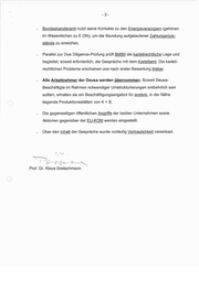 -i- - Bundeskanzleramt nutzt seine Kontakte zu den Energieversorgern (gehören im Wesentlichen zu E.ON), um die Stundung aufgelaufener Zahlungsrück- stände zu erreichen. - Parallel zur Due Diligence-Prüfung prüft BMWi die kartellrechtliche Lage und begleitet, soweit erforderlich, die Gespräche mit demKartellamt. Die kartell- rechtlichen Probleme erscheinen uns nach erster Bewertung lösbar. - Alle Arbeitnehmer der Deusa werden übernommen. Soweit Deusa- Beschäftigte im Rahmen notwendiger Umstrukturierungen entbehrlich sein sollten, erhalten sie ein Beschäftigungsangebot für andere, in der Nähe liegende Produktionsstätten vonK + S. - Die gegenseitigen Öffentlichen Angriffe der beiden Unternehmen sowie Aktionen gegenüber der EU-KOM werden eingestellt. - Über den Inhalt der Gespräche wurde vorläufig Vertraulichkeit vereinbart. SI t 1Ei GG 2 G- ® U— ba ; Ben Prof. Dr. Klaus Gretschmann