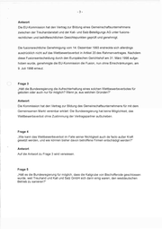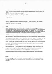 Kleine Anfrage der Abgeordneten Gerhard Jüttemann, Rolf Kutzmutz und der Fraktion der PDS zu "Aktuelle Folgen der Kalifusion von 1993" (BT-Drucksache Nr. 14/4033) vom 31. August 2000 1 Mehrabdruck Namens der Bundesregierung beantworte ich die o.g. Kleine Anfrage zu den aktuellen Folgen der Kalifusion 1993 wie folgt: Frage 1 „Ist es zutreffend, dass in dem 1993 von der Treuhand initiierten und abgeschlossenen Fusionsvertrag zwischen der Mitteldeutschen Kali AG Sondershausen und der Kali und Salz AG Kassel oder in nachfolgenden Verträgen geregelt wird, dass bis zum 31.12.2003 die Produktions- und Vertriebsinteressen der Kali und Salz GmbH nicht durch andere Firmen im Wettbewerb beeinträchtigt werden dürfen? Wenn ja, welche Regelungen sind das?" Antwort Der Entscheidung der Europäischen Kommission aus 1993 (vgl. Amtsblatt der Europäischen Gemeinschaften Nr. L 186/38 ff. vom 21. Juli 1994) war bereits zu entnehmen, dass sich die Vertragsparteien Treuhandanstalt und Kali und Salz AG, Kassel verpflichteten, gemäß Artikel 20 Abs. 1 des Rahmenvertrages vom 13.05.1993, für die Dauer von 10 Jahren weder unmittelbar noch mittelbar in Wettbewerb zu dem Gemeinschaftsunternehmen Kali und Salz GmbH, Kassel, zu treten. Nach Artikel 20 Abs. 2 verpflichteten sich die Vertragsparteien, bei der Veräußerung von Anlagen, Einrichtungen oder Beteiligungsrechten dieses Wettbewerbsverbot auf den Erwerber zu übertragen, sofern die erworbenen Aktivitäten geeignet sind, zu Wettbewerbszwecken gegenüber dem Gemeinschaftsunternehmen genutzt zu werden. Frage 2 „Welche Haltung hat nach Kenntnis der Bundesregierung die EU-Kommission zu diesem Vertrag im Allgemeinen und zu einem solchen Wettbewerbsverbot im besonderen einge- nommen?“