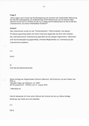Frage 9 „Worin liegen nach Ansicht der Bundesregierung die Ursachen der existentiellen Bedrohung der DEUSA Solbergwerke und Aufbereitungs GmbH Bleicherode und mit welchen Maß- nahmen will sie sich im Hinblick auf die o.g. Zusage des Bundeskanzlers für den Erhalt des Unternehmens und seiner Arbeitsplätze einsetzen?“ Antwort Das Unternehmen wurde von der Treuhandanstalt in 1992 privatisiert. Aus diesem Privatisierungsvertrag lassen sich keine Ansprüche gegenüber der BvS mehr herleiten. Die unternehmerische Verantwortung liegt allein bei den jetzigen Eigentümern. Gleichwohl prüft die Bundesregierung gegenwärtig, inwieweit Möglichkeiten zur Unterstützung des Unternehmens bestehen. zU. PSt D b) Chef des Bundeskanzleramtes Kleine Anfrage der Abgeordneten Gerhard Jüttemann, Rolf Kutzmutz und der Fraktion der PDS zu "Aktuelle Folgen der Kalifusion von 1993" (BT-Drucksache Nr. 14/4033) vom 31. August 2000 1 Mehrabdruck Hiermit übersende ich Ihnen einen Abdruck der Antwort auf die o.g. Kleine Anfrage. Richtlinien der Politik sind nicht betroffen. Zt), PStD