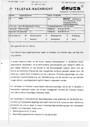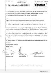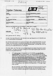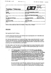 88-SEP-208@ 11:27 BMWI +49 BLN VUICZ3 1888 615 A +49 1888 615 5363 S.84/84 5363 | —® >> II. TELEFAX-NACHRICHT deausa Scelbergwerke und Aufbereitungs GmbH e Übernahme der Azubis bei bestandener Ausbildung, da dies den Azubis zugesagt wurde « Möglichkeit, die vorhandenen Anlagen 10 Jahre als Referenzanlagen zu nutzen « Noch auszuhandelnde Entschädigung der heutigen Gesellschafter. | K+S hat in den Gesprächen mindestens den 4 Punkt heute schon definitiv abgelehnt, Für die Due Diligence wurden 2 Phasen vereinbart, die im Protokoll nicht erkennbar sind. Aus unserer Sicht sollten die Aussagen von Ernst & Young, daß die deusa® GmbH nicht überschuldet ist und zukunftsträchtige Konzepte hat, ebenfalls im Protokoll erwähnt werden. Wir möchten Sie höflichst bitten, unsere Anmerkungen im Protokoll einzuarbeiten, damit auch die Position des Betriebsrates und der Geschäftsführung der dauss® GmbH berück- sichtigt wird. Mit bestem Dank für Ihre Unterstützung und in Erwartung des überarbeiteten Entwurfs ver- bleiben wir mit freundlichem Glück auf deus=® GmbH | L | " ( 1 . | | Ni Lensch . We h Geschäftsführer Geschäftsführer 7 a : L I — + . Kauf Betriebsratsvorsitzender Sollte die Übertragung dieses Telefaxes fehlerhaft sein, bitten wir Sie um Benachrichilgung GESAMT SEITEN 94